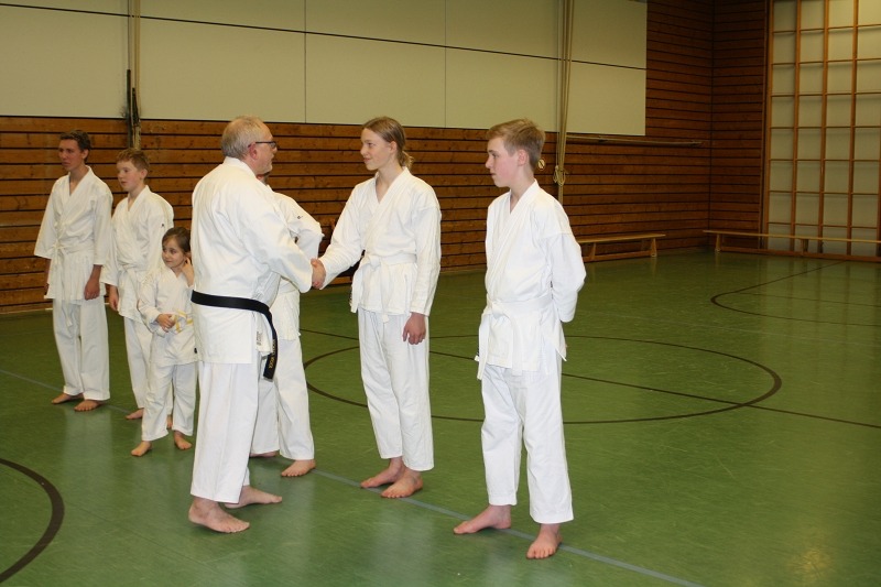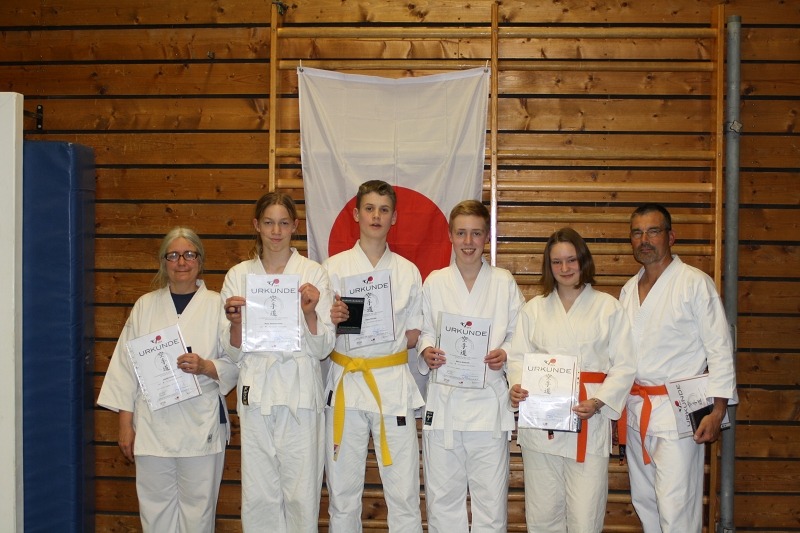 Der vorweihnachtlichen KYU-Prüfung stellten sich sechs Karatekas. Die Prüfung nahm Michael Meier 3. Dan und Frauke Meier 2. Dan in Laatzen ab. Alle sechs haben dank intensiver Vorbereitung ihre neue Graduierung bestanden. Gruppenbild von links nach rechts: Camille Fausten (8. Kyu), Meno Stemmermann (8. Kyu), Thure Püschel (7. Kyu), Marco Schmoldt (8. Kyu), Nadine Geller (6. Kyu), Peter Weschollek (6. Kyu)